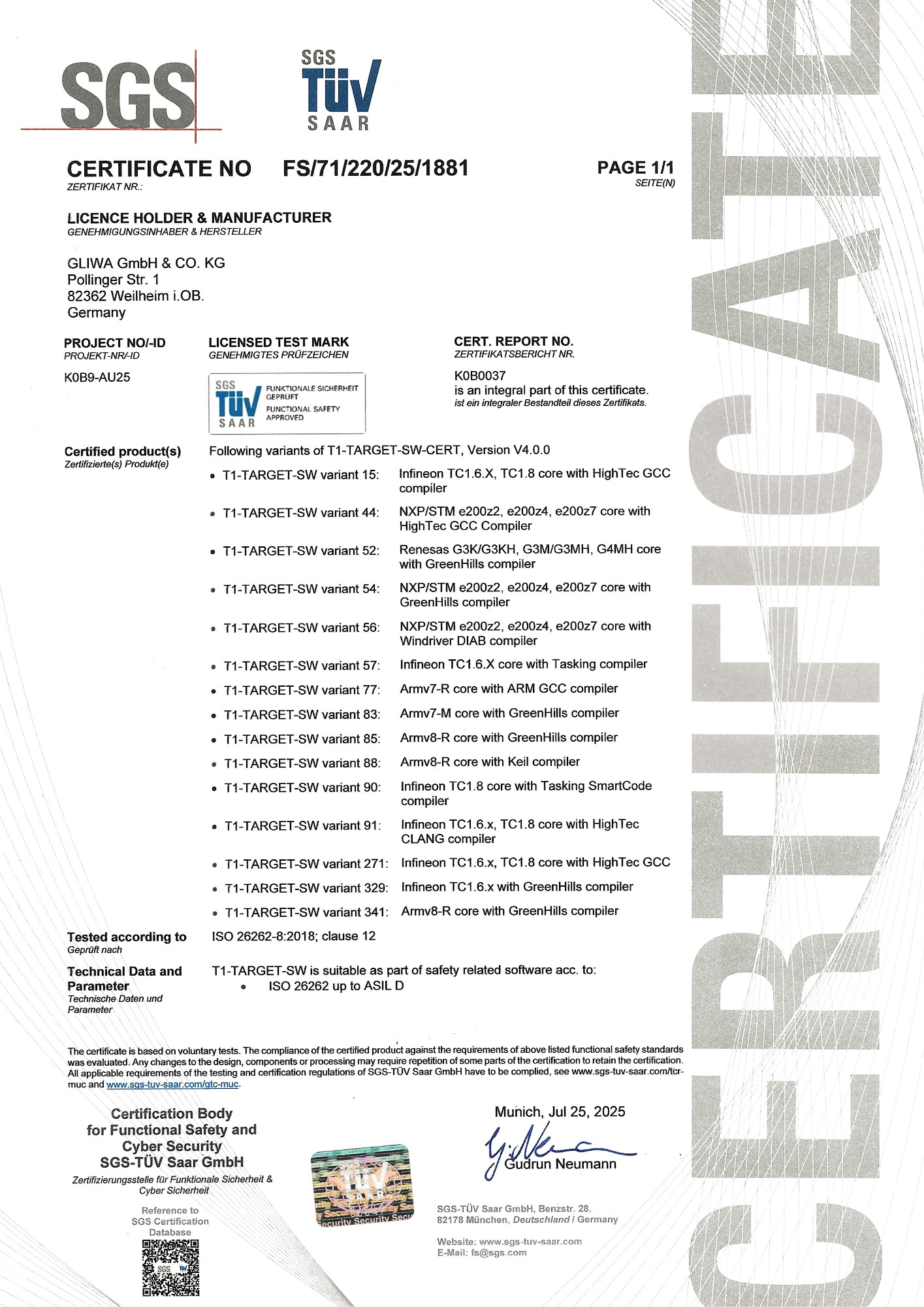 Various versions of the T1-TARGET-SW were developed according to ISO 26262 to be used up to ASIL D. This enables our customers to furthermore use the T1 timing analysis features after finishing the development phase.