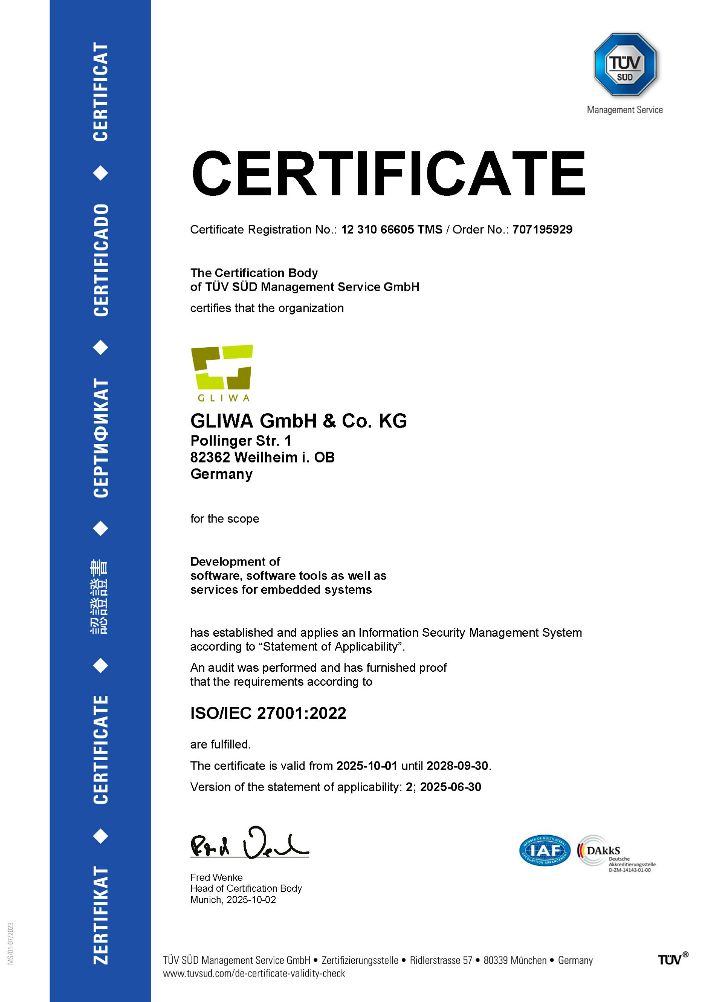 GLIWA is ISO 27001 certified since 2025, demonstrating our commitment to maintaining the highest standards in information security. This internationally recognized certification confirms that we have implemented a robust Information Security Management System (ISMS) to protect sensitive data and ensure compliance with global best practices.